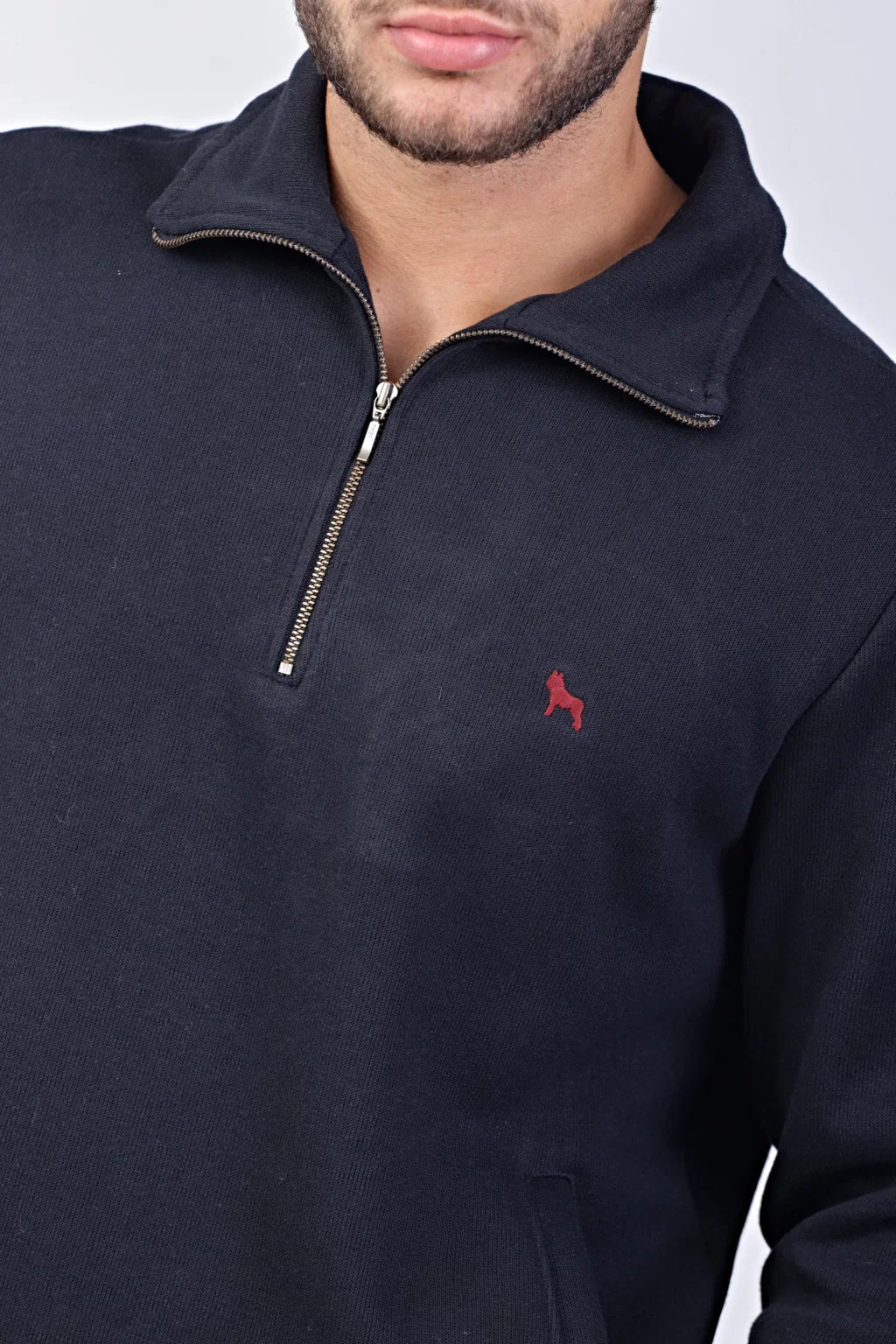 El diseño de la prenda cuenta con cuello alto con medio cierre, puños y cintura en morley con elastano. Está personalizado con el logo bordado a contra tono en la parte delantera superior izquierda.