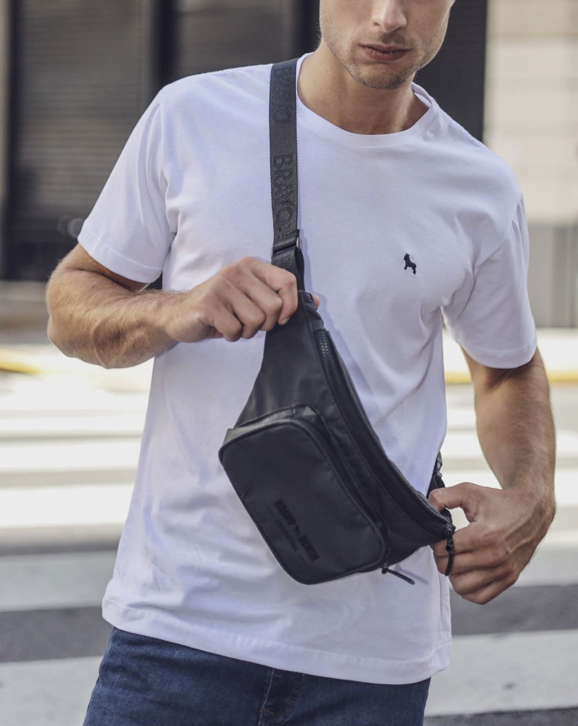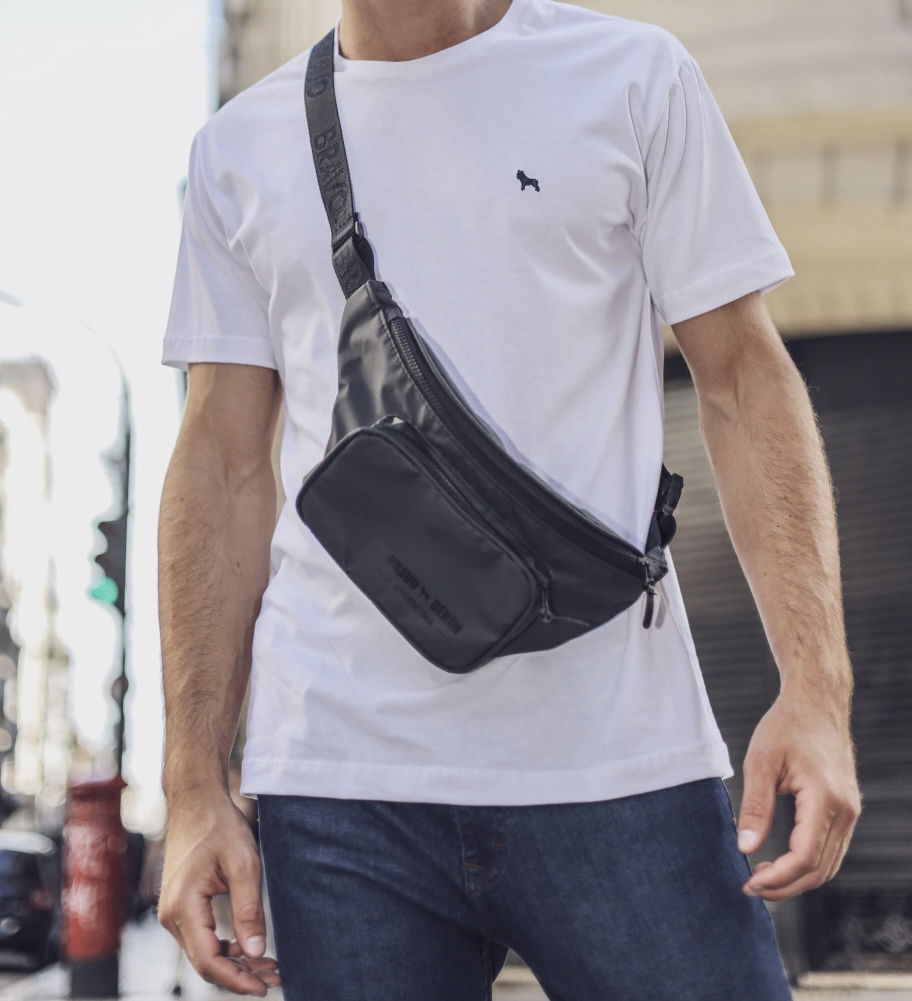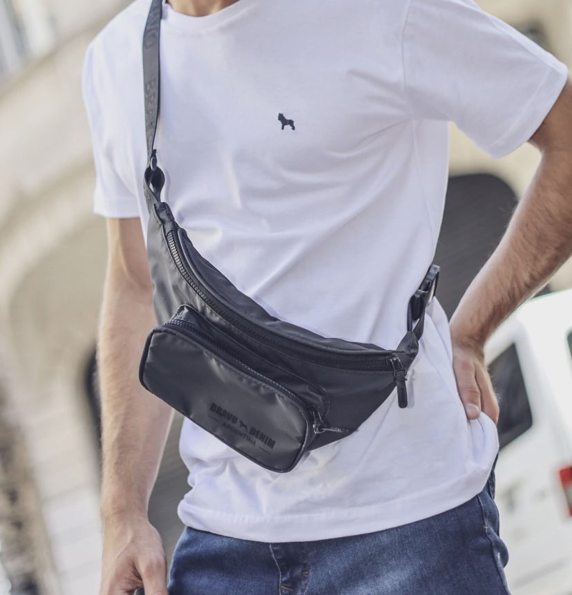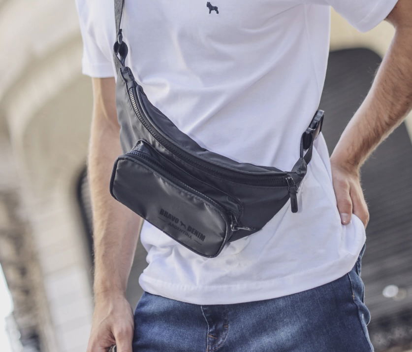Riñonera color negra de tela impermeable con boldillo delantero.