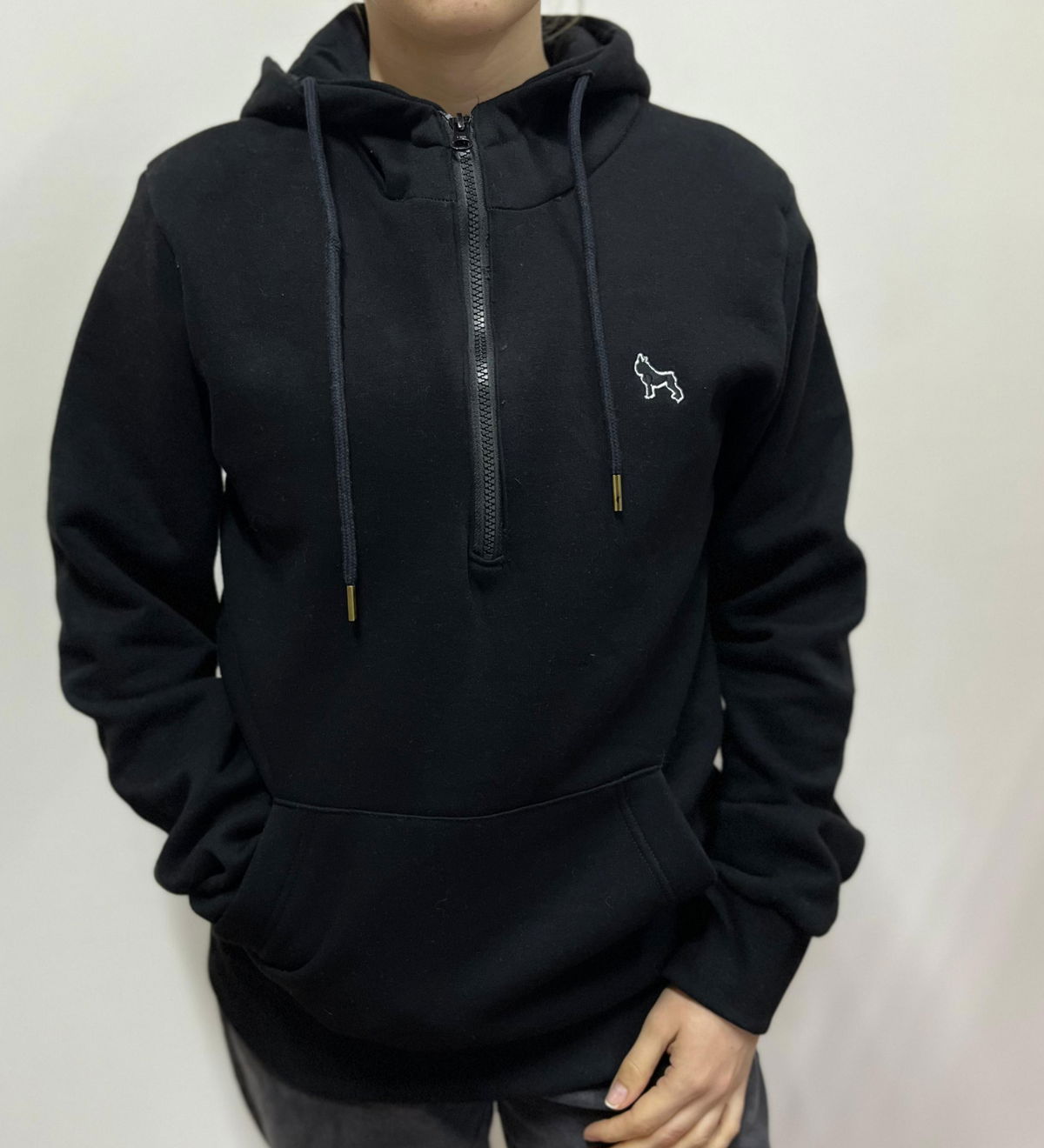 Buzo canguro de frisa con medio cierre al tono de la prenda