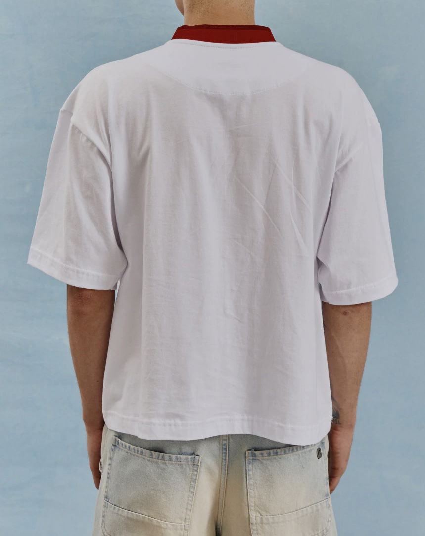 Incluye estampa en delantero, etiqueta en DTF y cuello tejido de polyester bicolor que le da un detalle único y moderno.